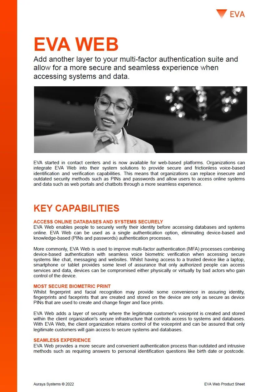Powered by Auraya’s ArmorVox AI engine, EVA Web enables users to securely verify their identity before accessing online systems and data. With voice, the multifactor authentication process is improved and can replace outdated and intrusive methods such as security questions or OTPs for a more secure and convenient user experience. This document showcases EVA Web and its value to organizations and customers as well as its comparison against current security methods.